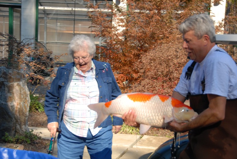 Member Doris Poppe watches as a kohaku is delivered to it's