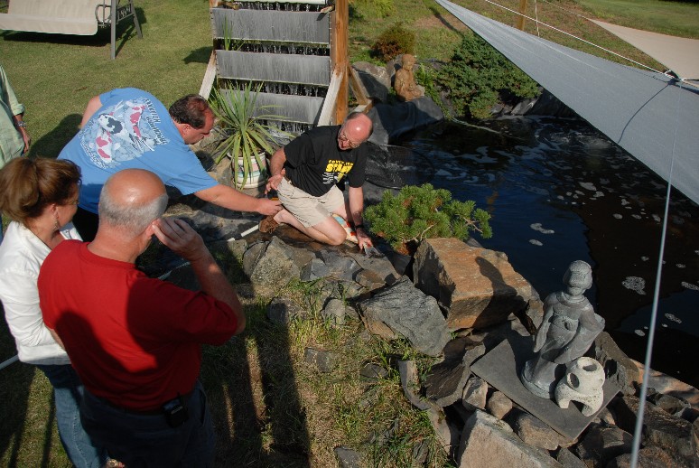 This meeting was held on a beautiful September day at the North's house in Manassas VA. Turnout was lower then hoped but all that attended had a great time! The meeting started with Jim North showing everyone his ponds and explaining how the filtration systems on each pond worked. He also discussed the backgrounds of some of his koi. Mike Frady then spoke a little bit about the goals of ZNA Potomac and the direction of the club. Our guest speaker then showed us a wonderful presentation on cold water effects on koi and how to prepare your pond for winter in the mid-atlantic region. There was much discussion on this topic after the presentation was over. As special treat to those attending Richard Carlson then treated one of Jim North's koi by injecting Baytril and treating an ulcer on it's gill plate with a PP paste. (more updates to be added in the next few days)